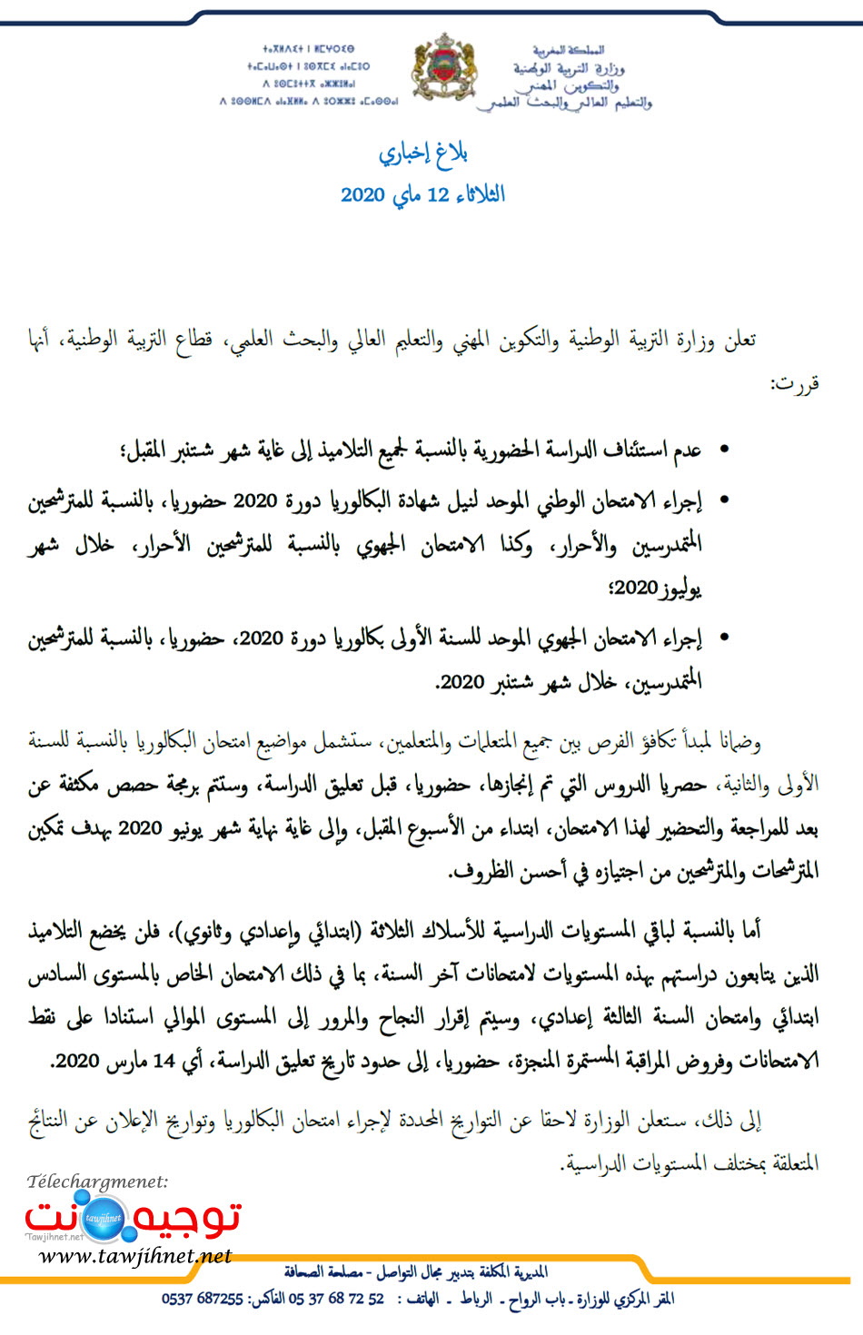 بلاغ عاجل من وزارة التربية الوطنية 12 ماي 2020 منتديات توجيه نت